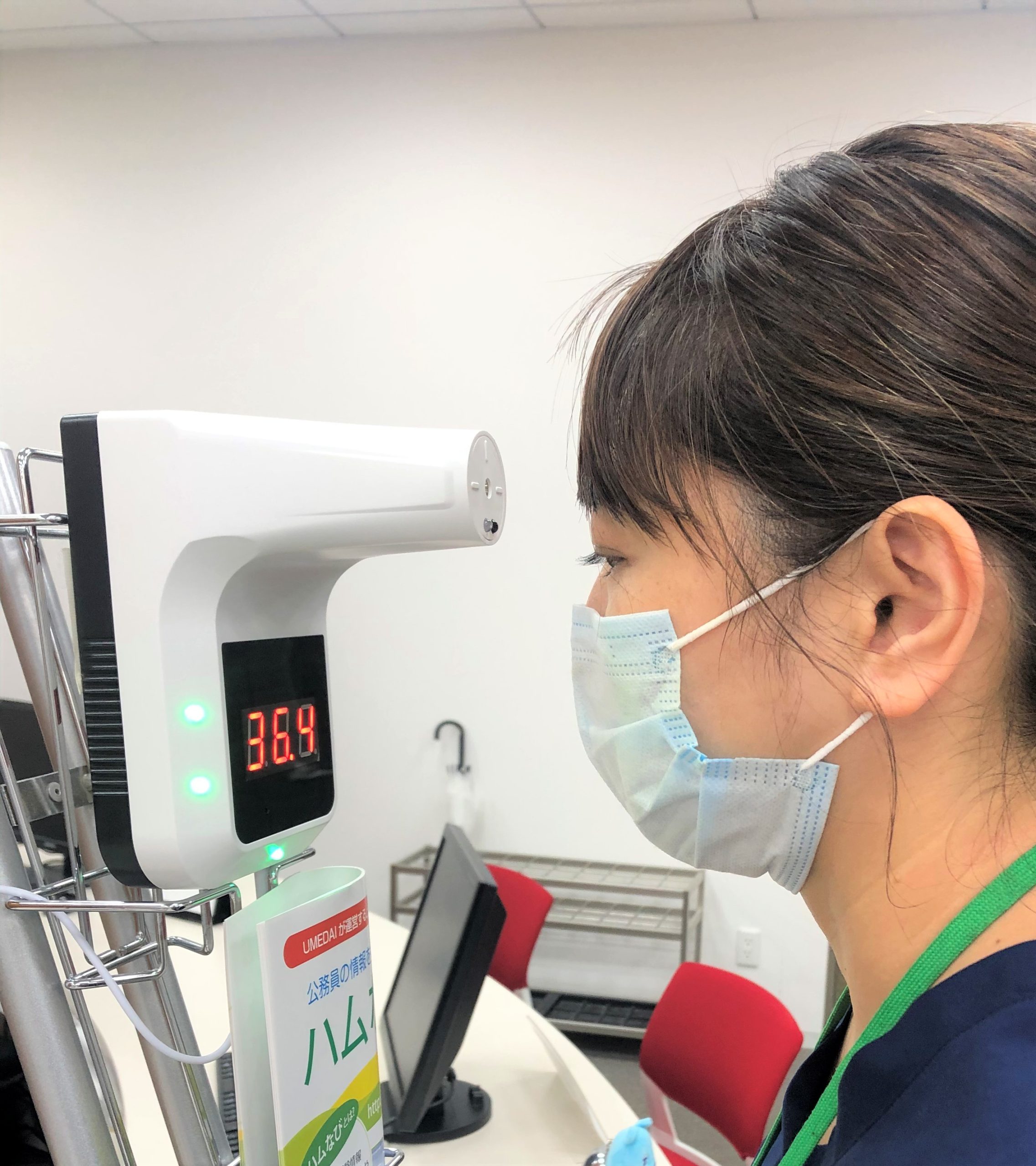 この度、入口に体温の自動測定器を導入しました。
