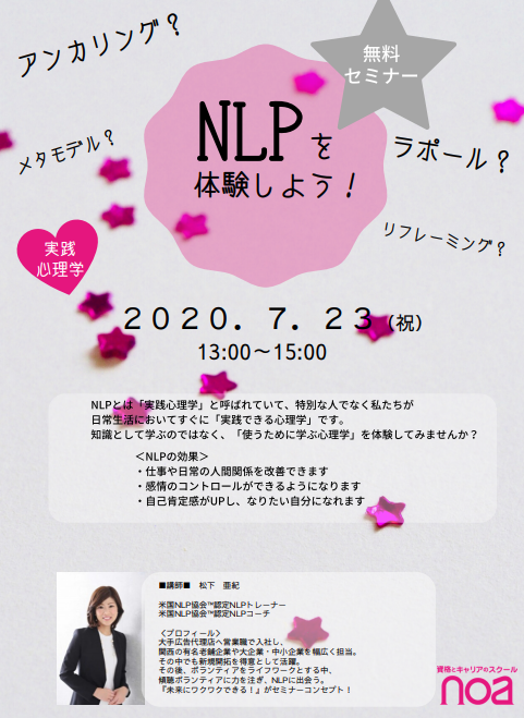 ・申込方法:こちらからお申込みください(お問合せ内容の欄に「7/23NLPセミナー参加希望」とご記入ください)