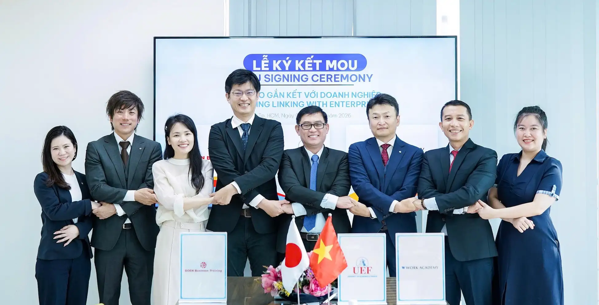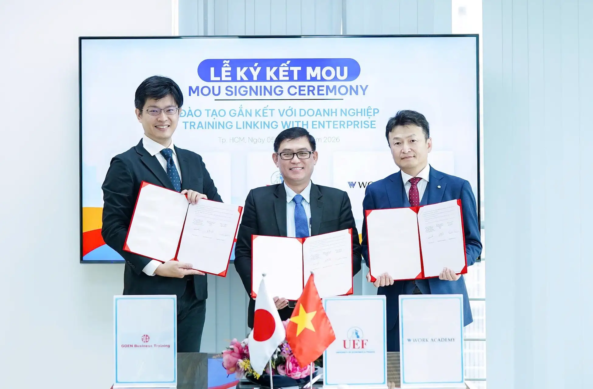 [ホーチミン] – 日本の大学教育機関向けにキャリアプログラムを提供し、noaを運営する株式会社ワークアカデミー(本社:大阪府、以下「ワークアカデミー」)は、2026年3月5日、ベトナムの主要大学であるホーチミン市経済金融大学(Ho Chi Minh City University of Economics and Finance、以下「UEF」)および現地教育研修機関のGOEN Business Training(以下「GOEN」)と、教育・イノベーション・人材育成に関する三者間覚書(MOU)を締結しました。